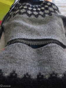 Ég tók mig s.s. til og klippti hana í tvennt í mittinu, sneri neðra stykkinu við og lykkjaði saman. Það tókst ótrúlega vel og peysan smellpassar núna.