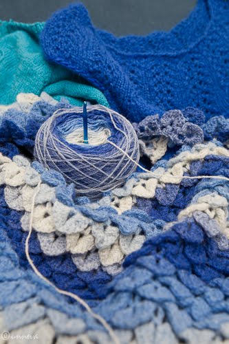 Um daginn frétti ég að kóngablái plötulopinn væri kominn aftur. Ég er búin að bíða og vona svo lengi að ég rauk út í búð og keypti mér kíló. Þegar ég var síðan sest niður og byrjuð að prjóna kjól úr honum fattaði ég að ég var á sama tíma með sjal í gangi úr bláum tónum, blágrænan skokk og nýbúin að kaupa kóngablátt garn í vettlinga og húfu. Sem sagt blátt blátt blátt þessa dagana hjá mér. Kannski er það vetrartíminn.