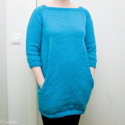 Ég byrjað á þessum kjól í sumar. Var alveg hoppandi kát þegar ég fann uppskriftina, keypti hana strax og byrjaði að spá í garn. Það tók mig heillangan tíma að velja lit og ég gerði ýmsar tilraunir með garn. Ég tímdi nefnilega alls ekki að kaupa Drops Alpaca sem er gefið upp og endaði s.s. á að nota Sisu í þessum fína túrkísbláa lit.