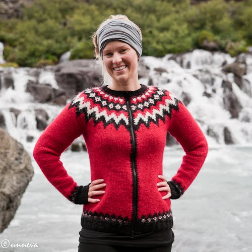 Við stoppuðum líka og skoðuðum Hraunfossa þar sem mér fannst tilvalið að monta mig aðeins af rauðu útivistarlopapeysunni minni.