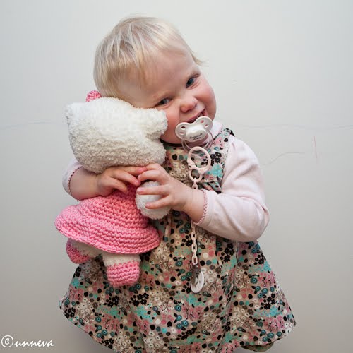 Ég notaði eitthvað mjúkt Phildar garn, úr Föndru, í hausinn og hendurnar en Tove úr Europris í kjólinn. Mér gekk reyndar ferlega illa að festa hausinn á þannig að hann varð svolítið teygður. En ég er samt nokkuð ánægð með útkomuna. Þetta var allavega mun skemmtilegra og ódýrara en að fara út í búð og kaupa tilbúinn bangsa 🙂