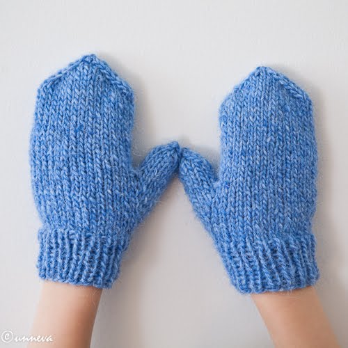 Ég bjó til nýja uppskrift í gær. Hún er af einföldum barnavettlingum með þumaltungu. Ég miða við að þeir séu úr léttlopa og fyrir 2-3 ár eða 4-5 ára. Mér finnst nefnilega orðið þægilegra að gera vettlinga með þumaltungu frekar en að gera hefðbundinn þumal. Reyndar kannski ekki ef maður er með munstur en fyrir svona fjöldaframleidda, einlita vettlinga þá er þetta snilld að kunna.