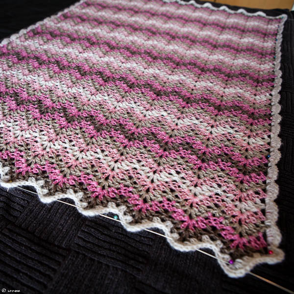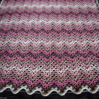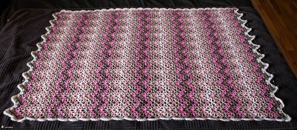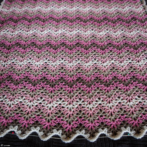 Ég kláraði ungbarnateppið um helgina. Er rosalega ánægð með það. Fyrst var ég samt eitthvað að svekkja mig á því að það væri svo þétt í sér og minna heldur en ég hafði ætlað. En eftir þvott og góða strekkingu varð það eiginlega fullkomið. Nú langar mig helst að skella í annað og annað og annað og …