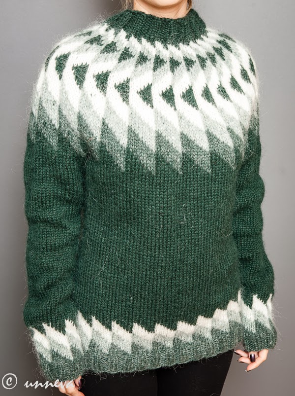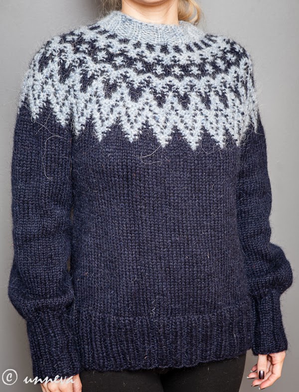Seinni peysan er Jón (undarlegt nafn á peysu finnst mér) úr Lopi 31. Hún er einnig úr tvöföldum plötulopa og mér finnst litirnir og munstrið ofsalega fallegt og merkilega skemmtilegt að prjóna.