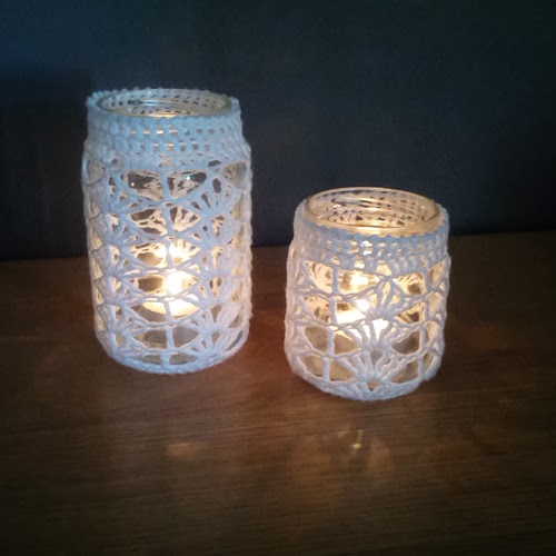 Þeir eru heklaðir úr fíngerðu bómullargarni utan um tómar krukkur. Uppskriftina má finna hér.