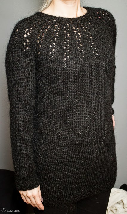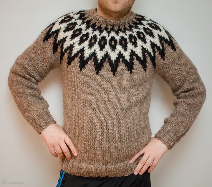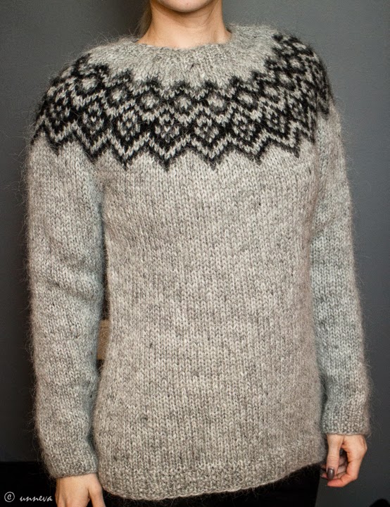 | Þetta er peysan Styrkur úr Lopi 29. Ég gerði hana úr létt lopa frekar en tvöföldum plötulopa. Þannig verður hún miklu léttari og ekki eins heit. |